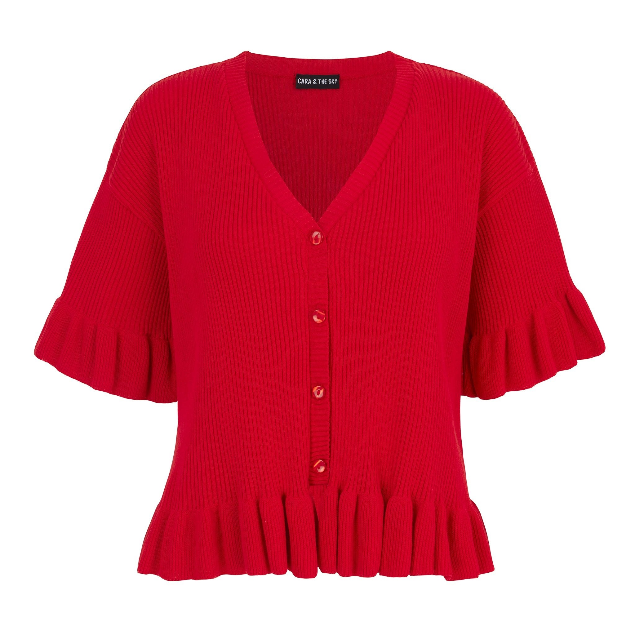 Introducing our Marlow Knitted Ruffle Sleeveless Cardigan in red – the prettiest summer cardigan around!