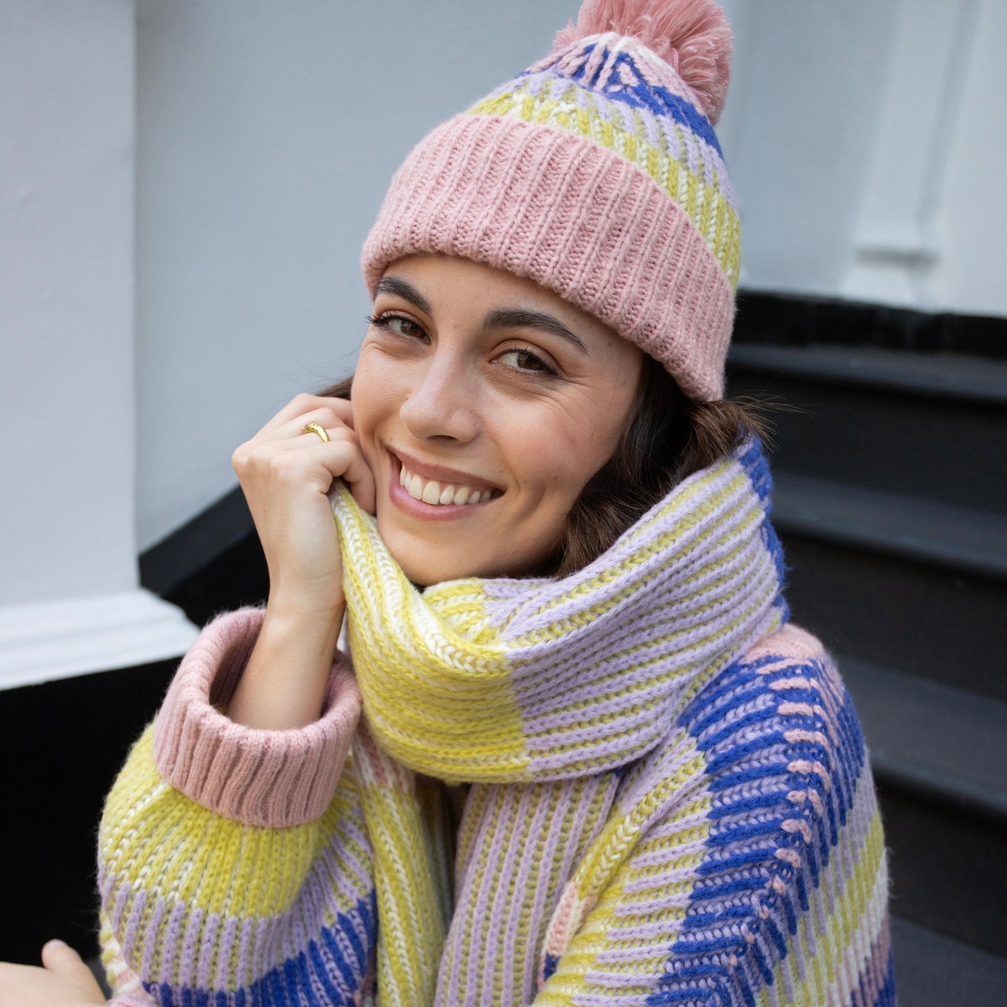 Say hello to your new pink obsession. Our Phoebe Hat and Leia Scarf in Pink make the softest happiest winter set with a playful stripe detail that lifts every outfit. Both pieces are made here in the UK in small batches using vegan friendly yarns so they feel as good as they look.