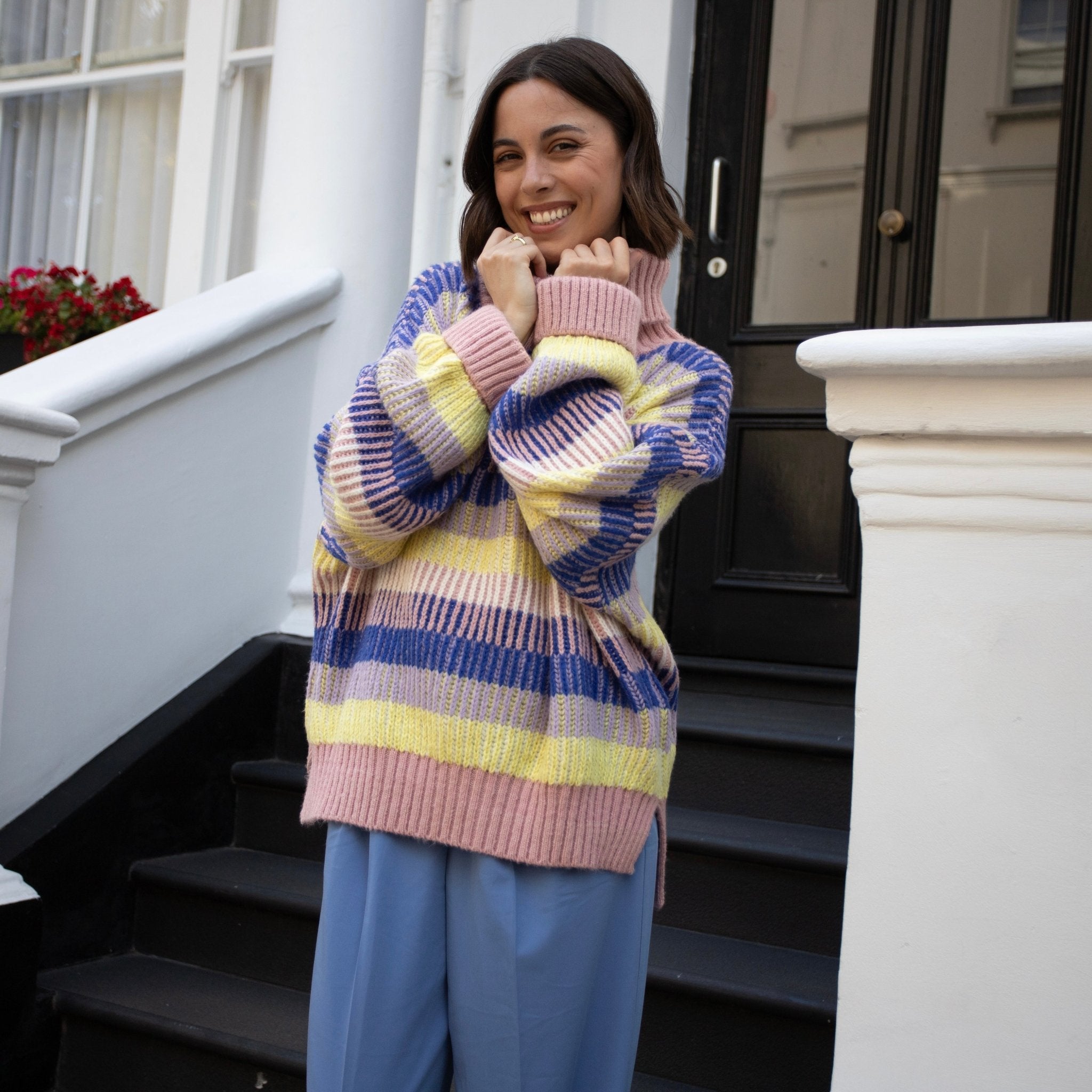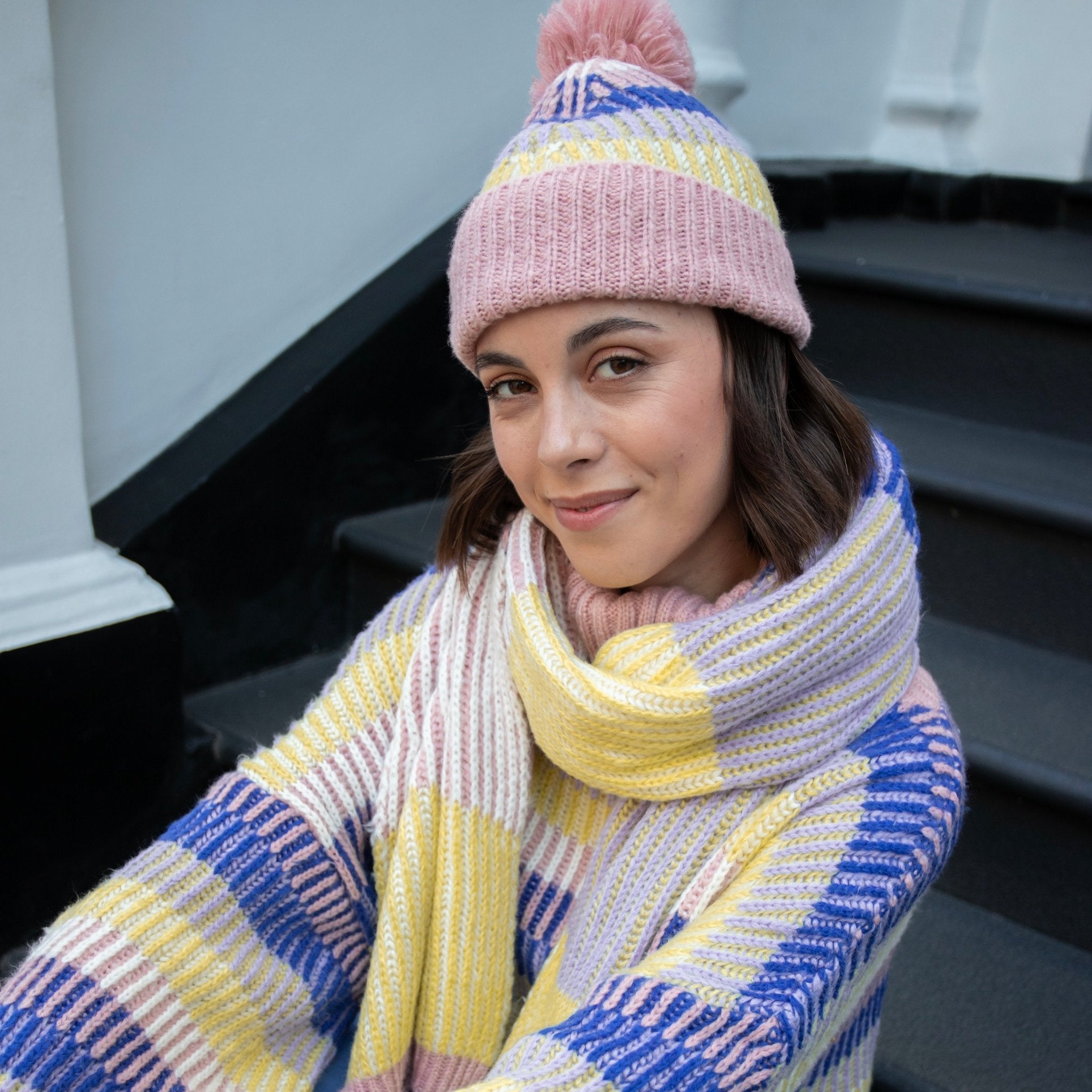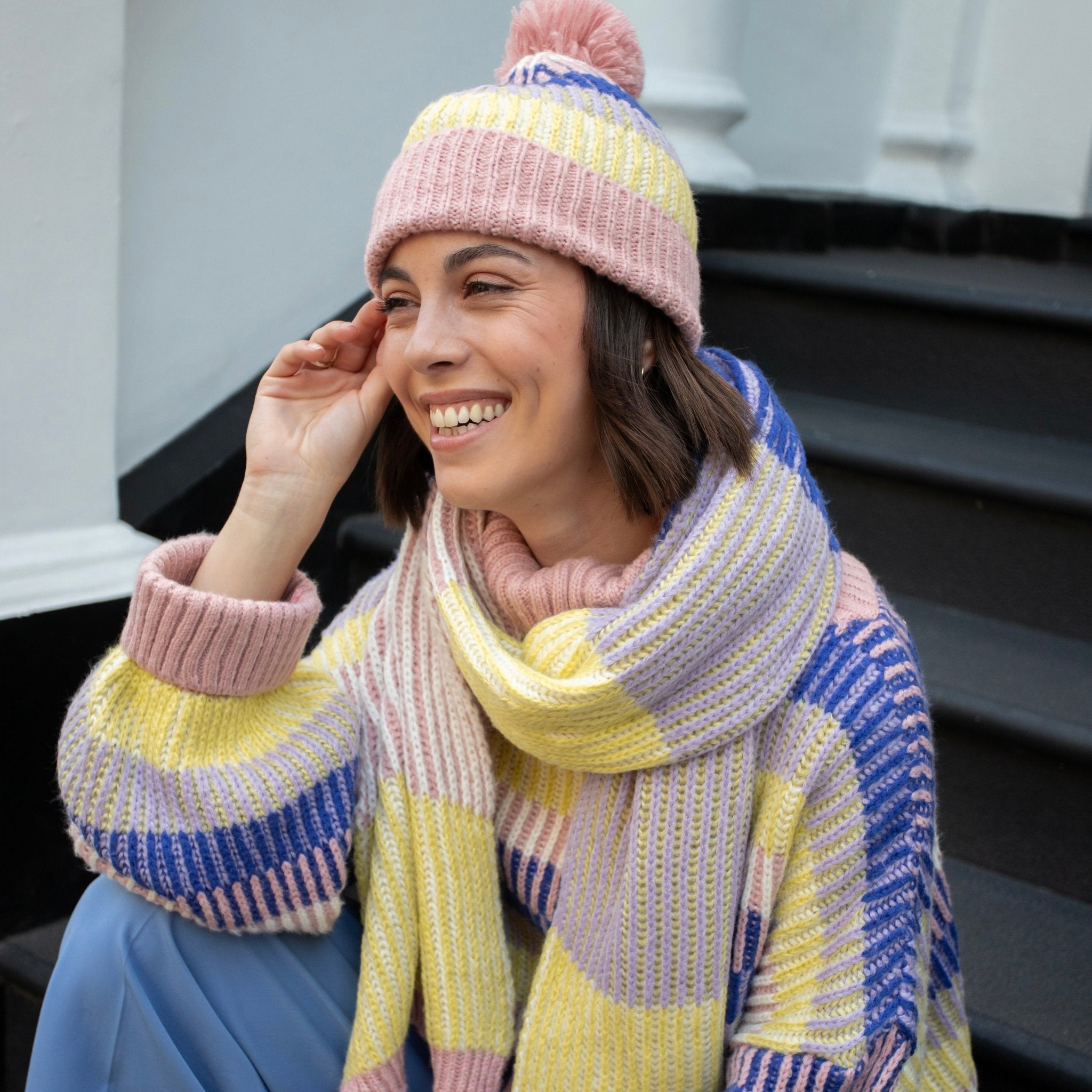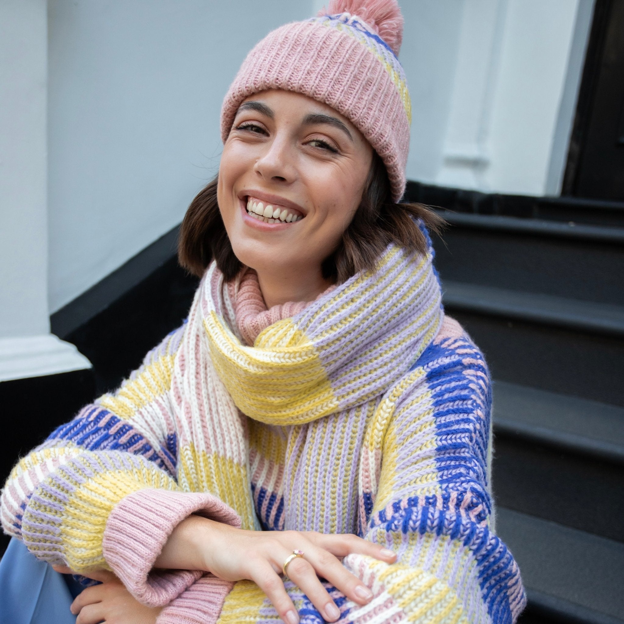 Our Phoebe Hat Leia Scarf and Tasha Jumper come together to create the dreamiest winter styling trio with playful stripe detailing on the accessories, and that signature oversized Tasha silhouette.