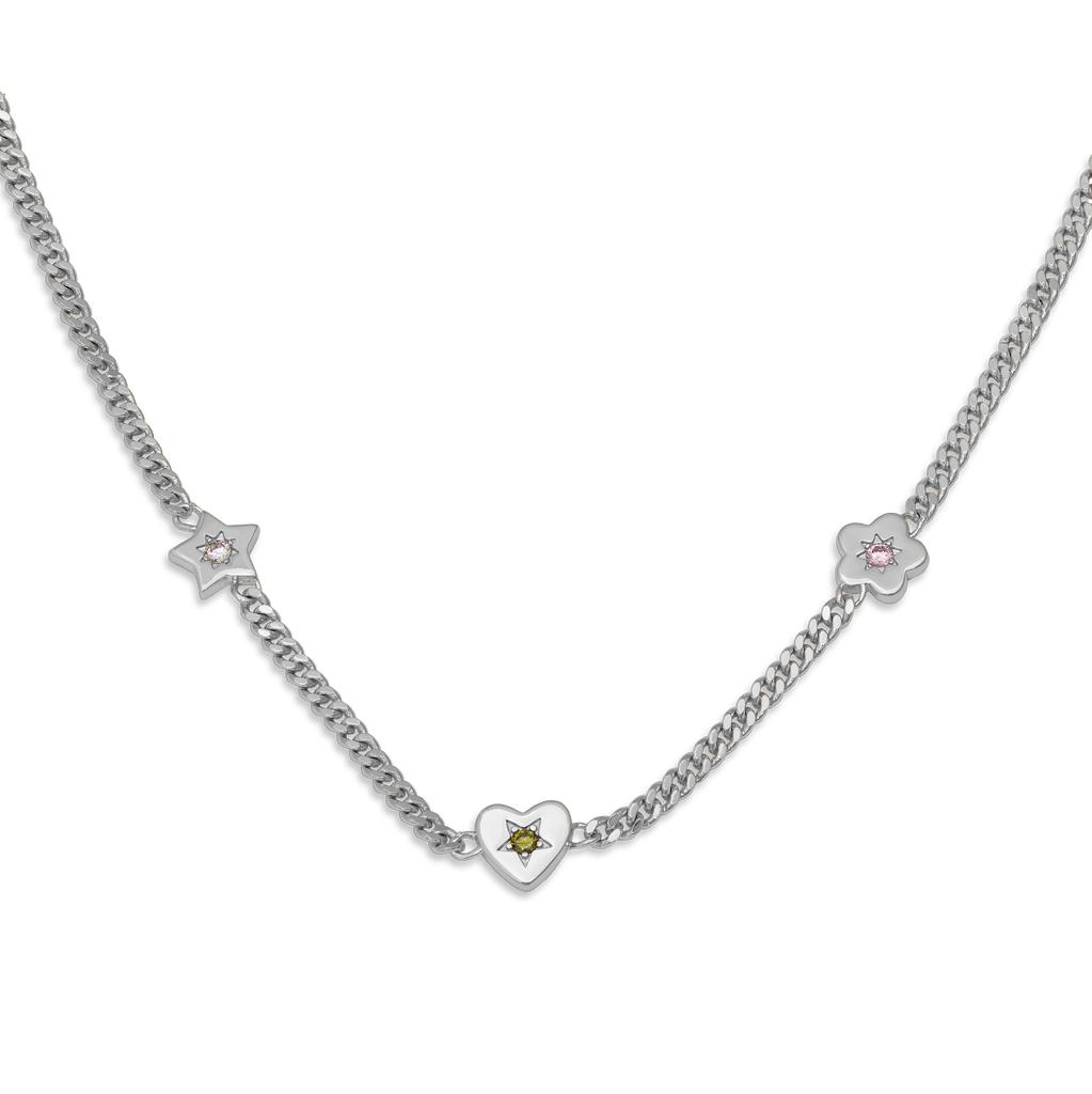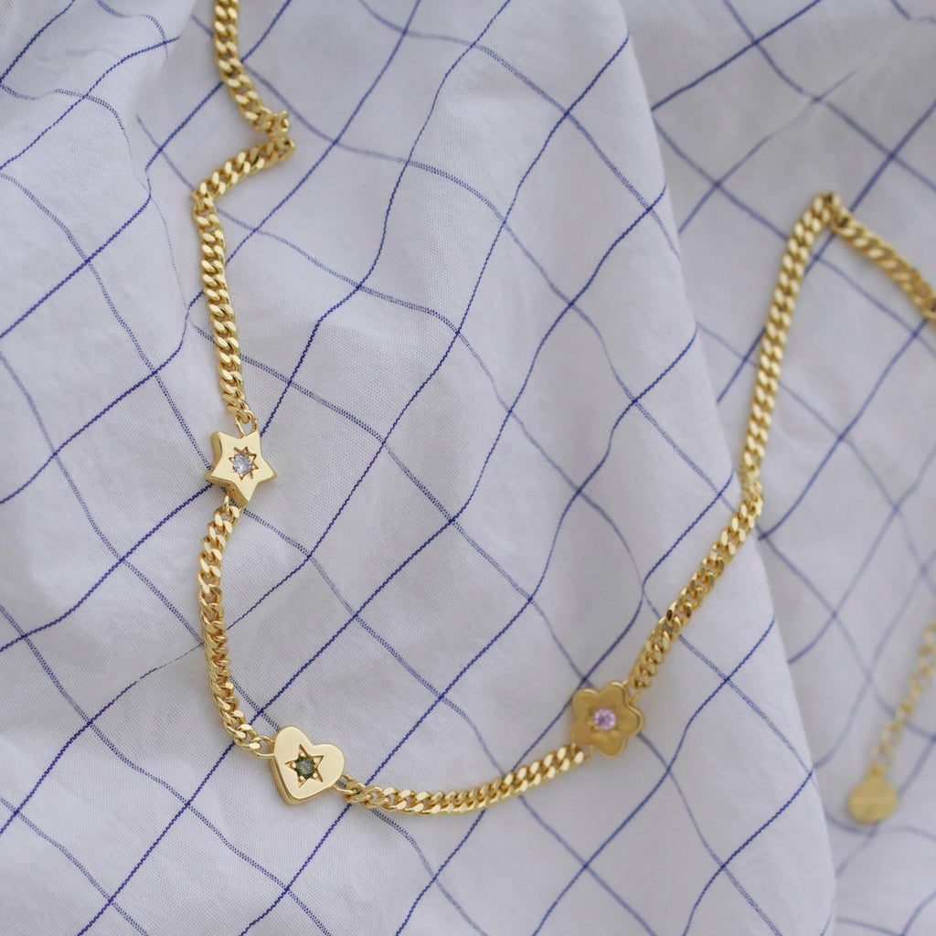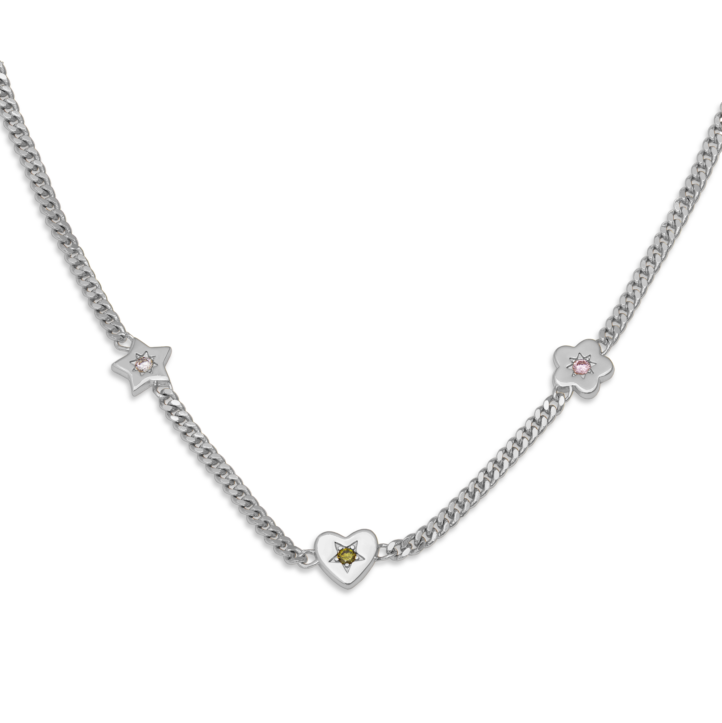 Inspired by the whimsical, carefree aesthetic of the 70s, our trio of charms hang from this chunky flat chain necklace designed to sit pretty on your collarbone.