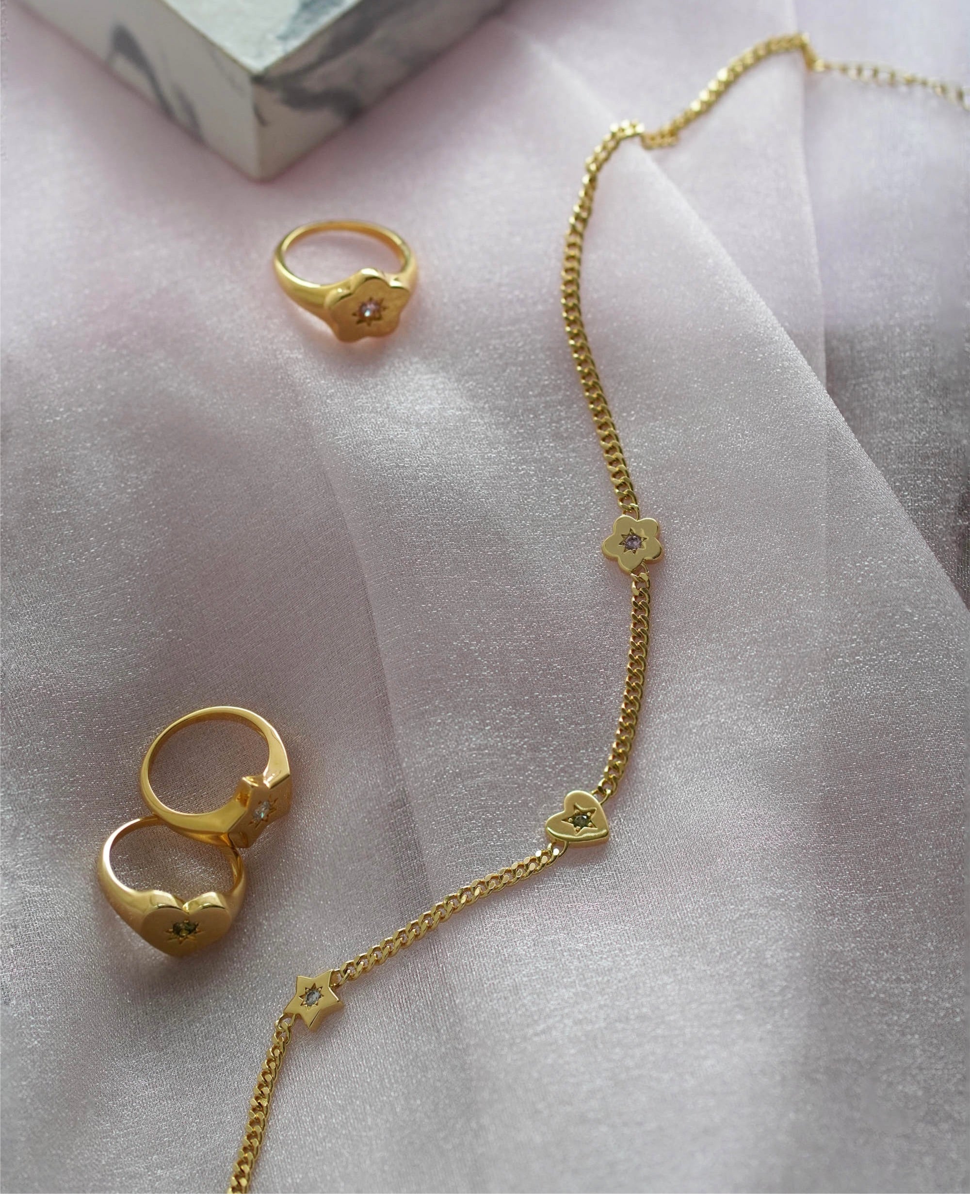 The retro-style heart, star and flower charms are each decorated with a pastel gemstone set inside a starburst for a little extra drama.