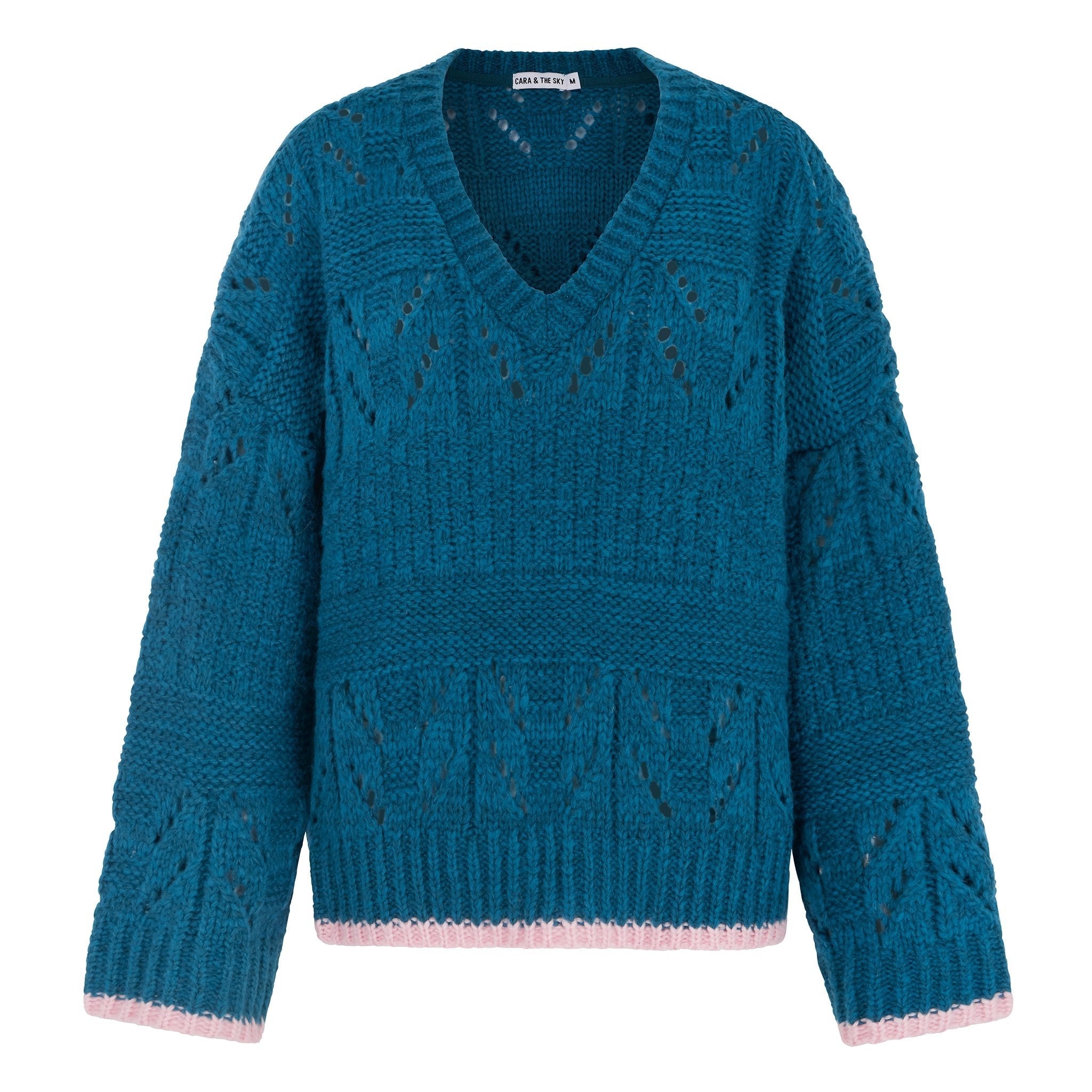 Our Zoe pointelle knit jumper has a bold chevron pattern and contrast details at the hem and cuffs to give it that Cara & The Sky twist.