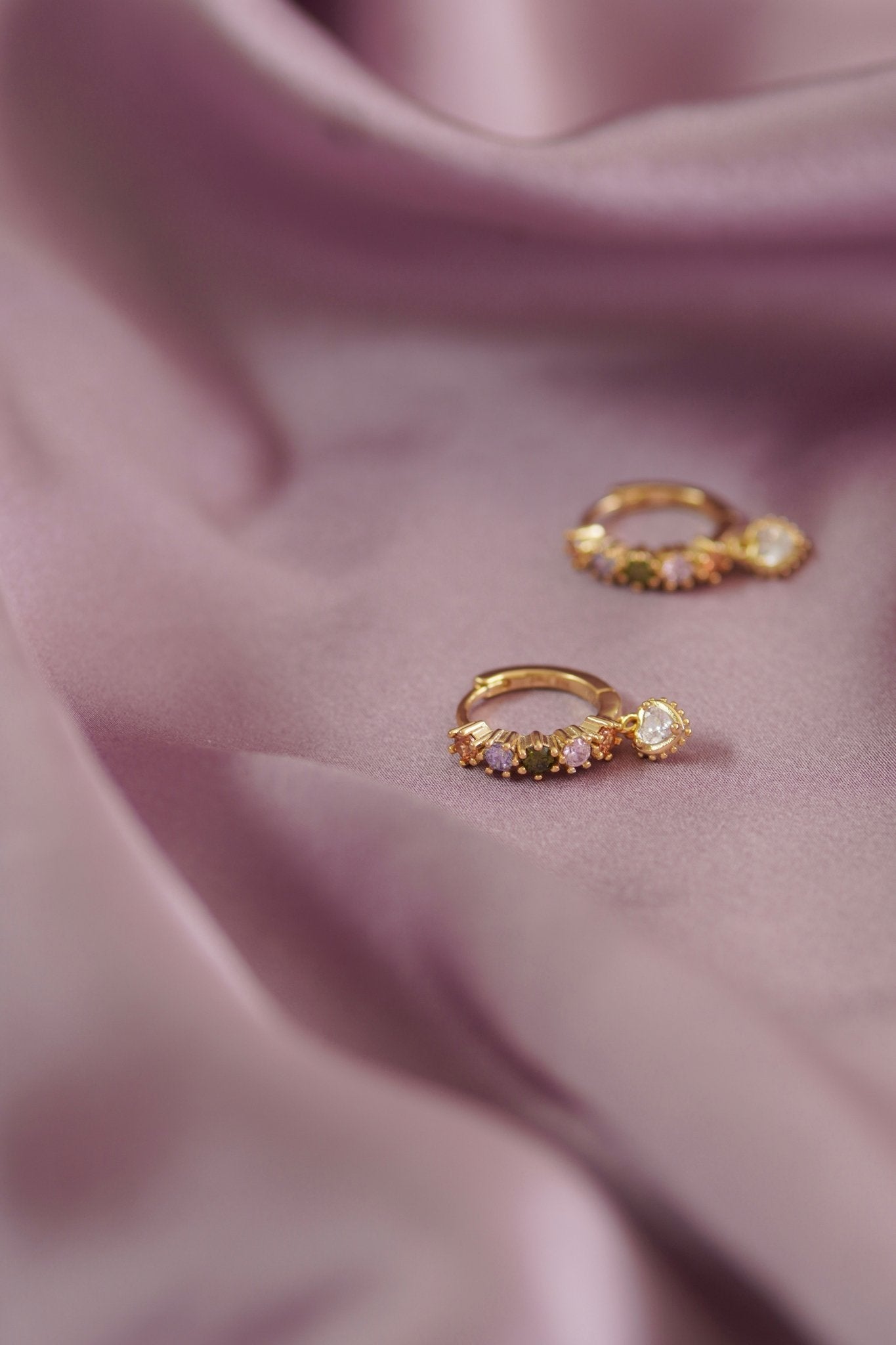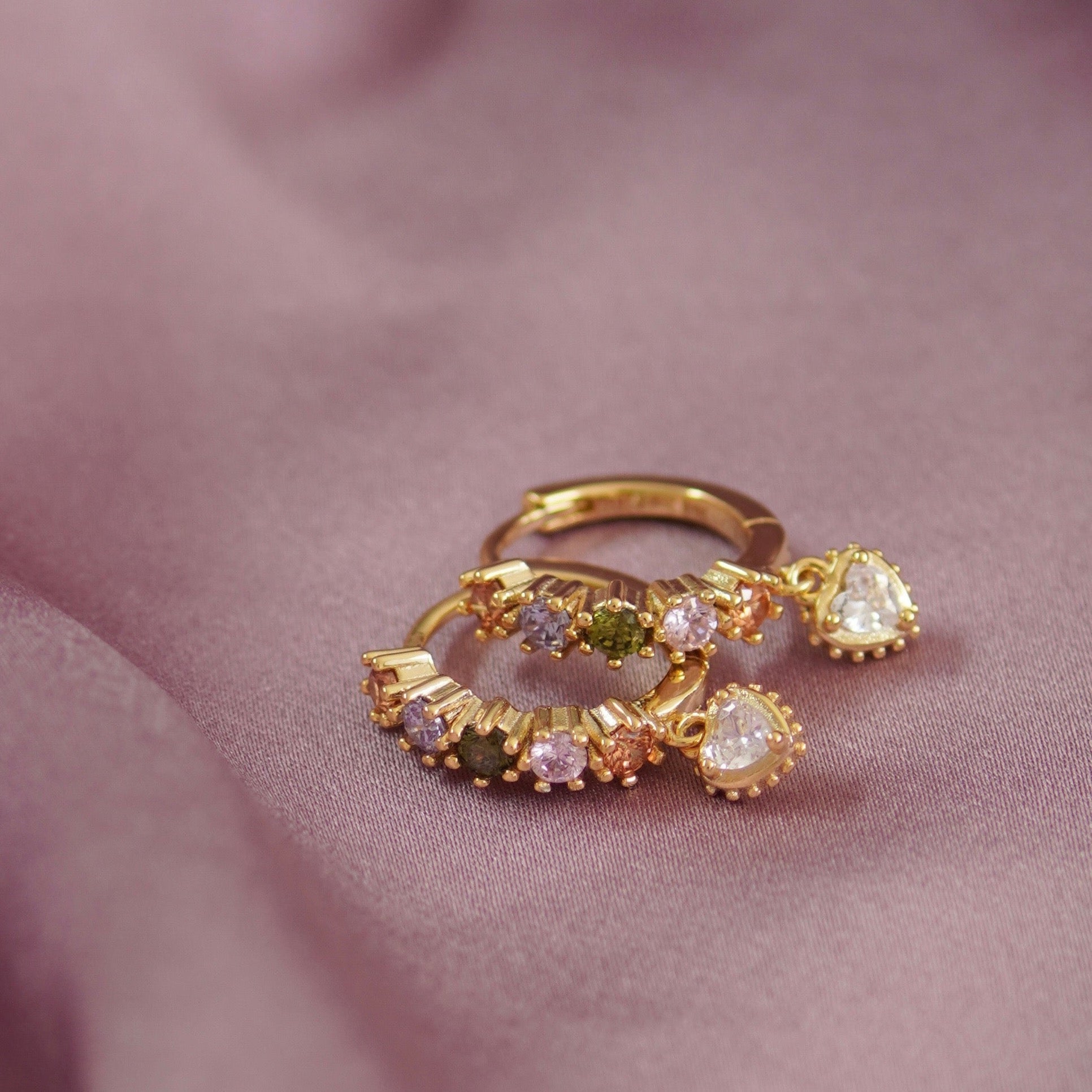 There's no sugar-coating needed for these embellished beauties. The hoops are encrusted with gemstones like pastel coloured candies. A white stone heart charm hangs from the mid-size hoops.