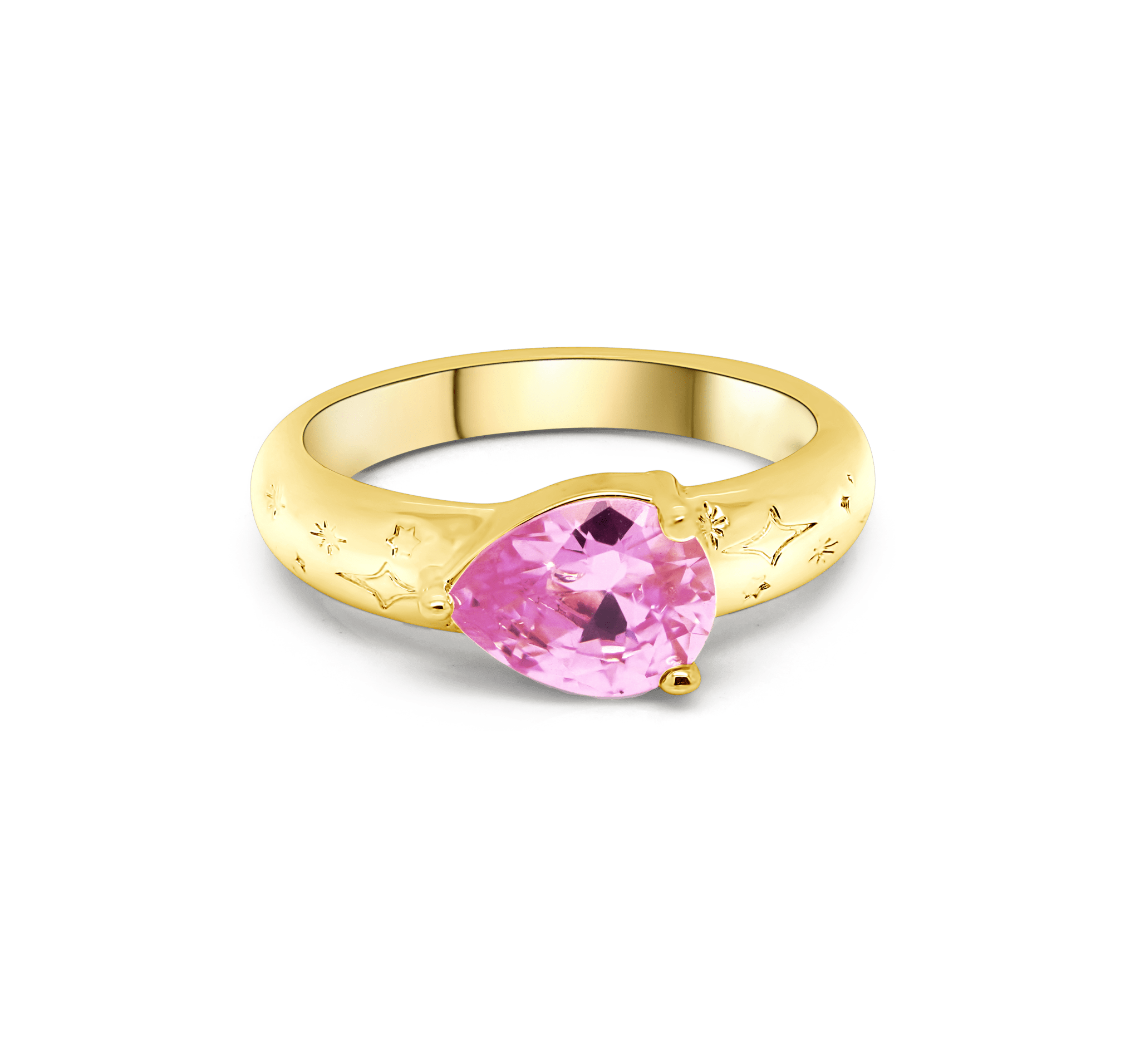 Sweet like a pear drop candy, the juicy east-west set pear shaped gemstone is a real show stopper. Topped off with engraved star illustrations for a celestial touch.