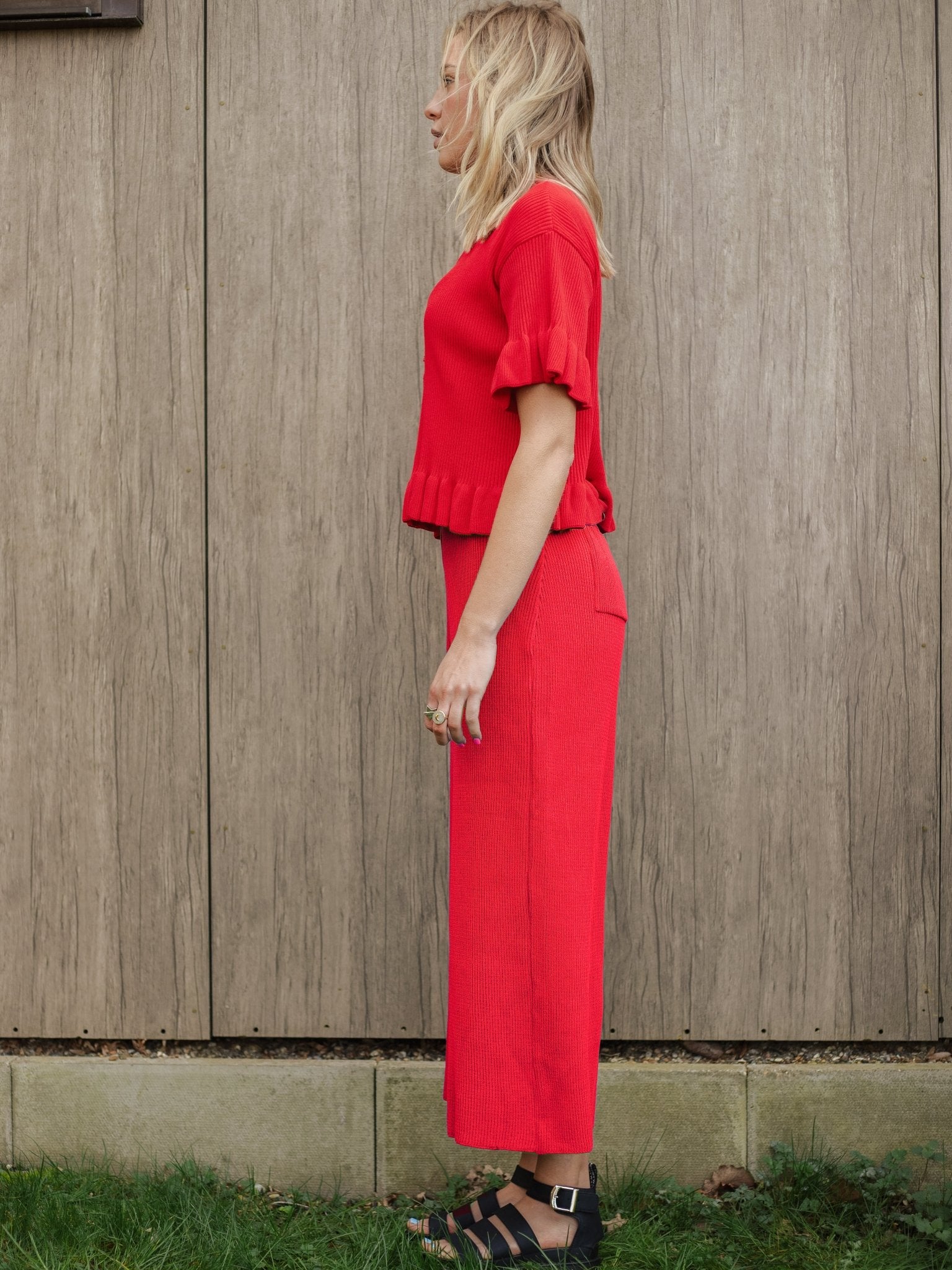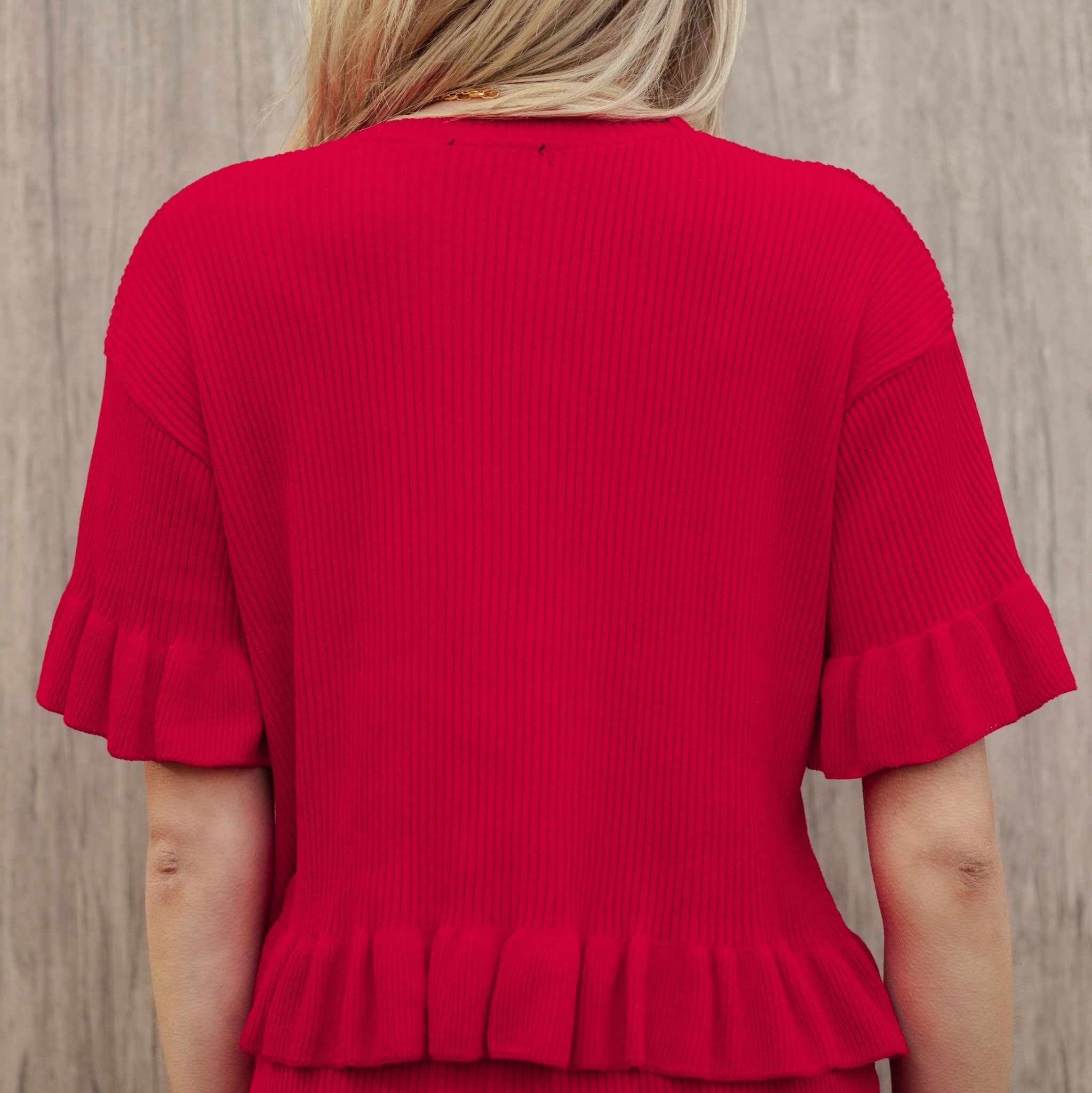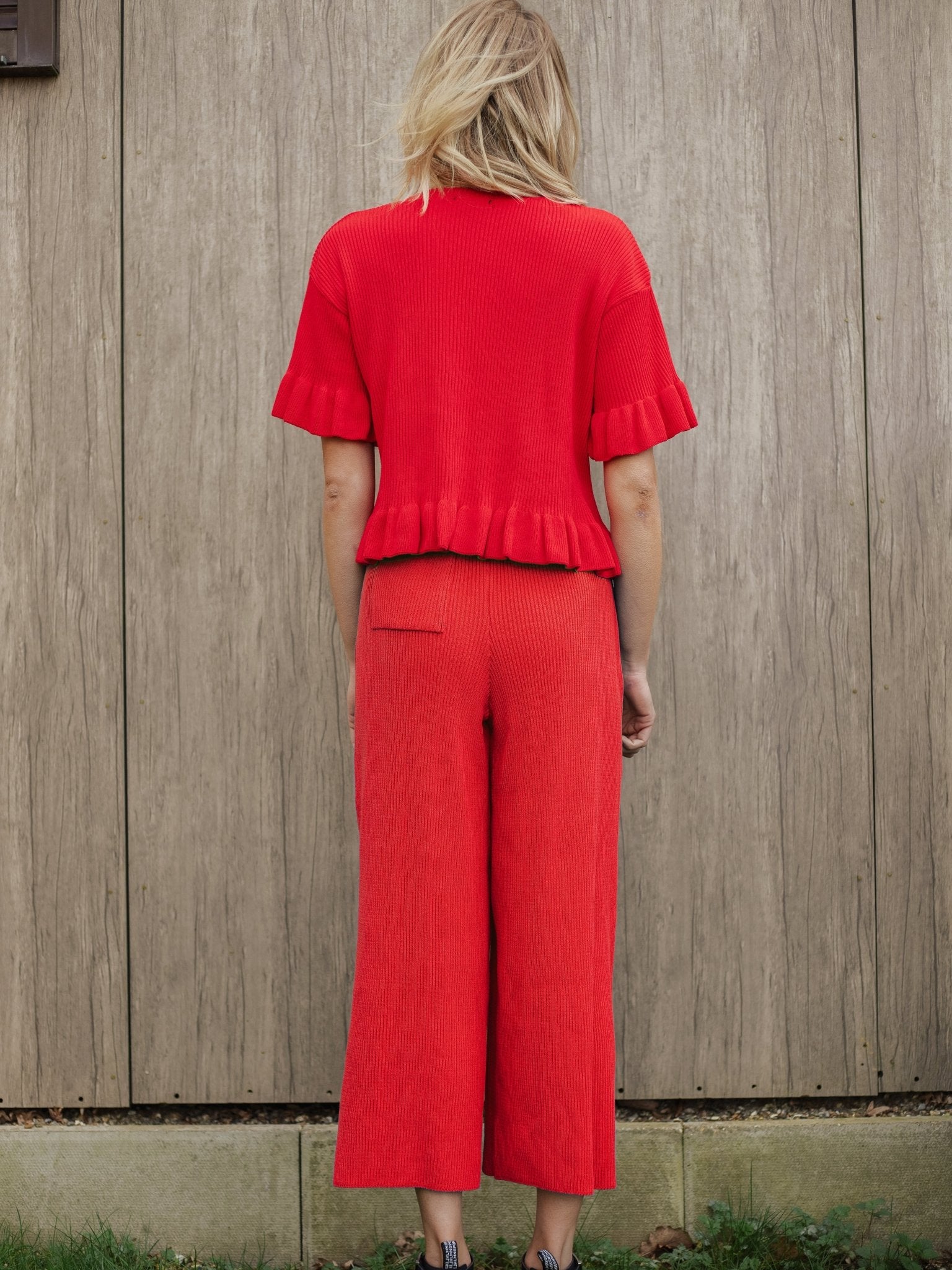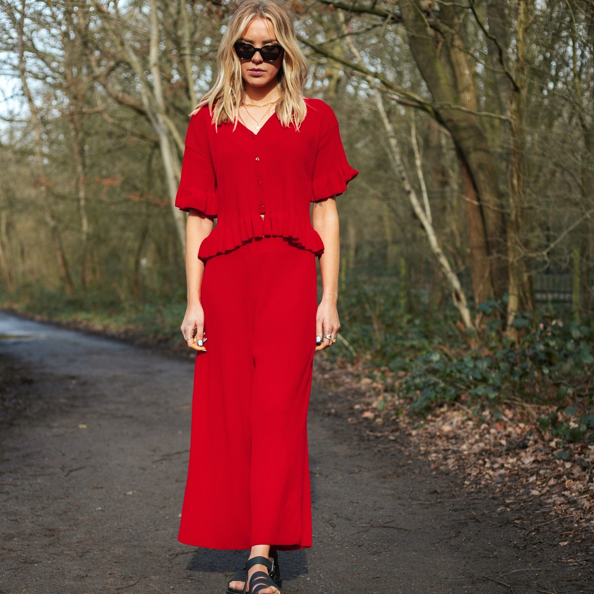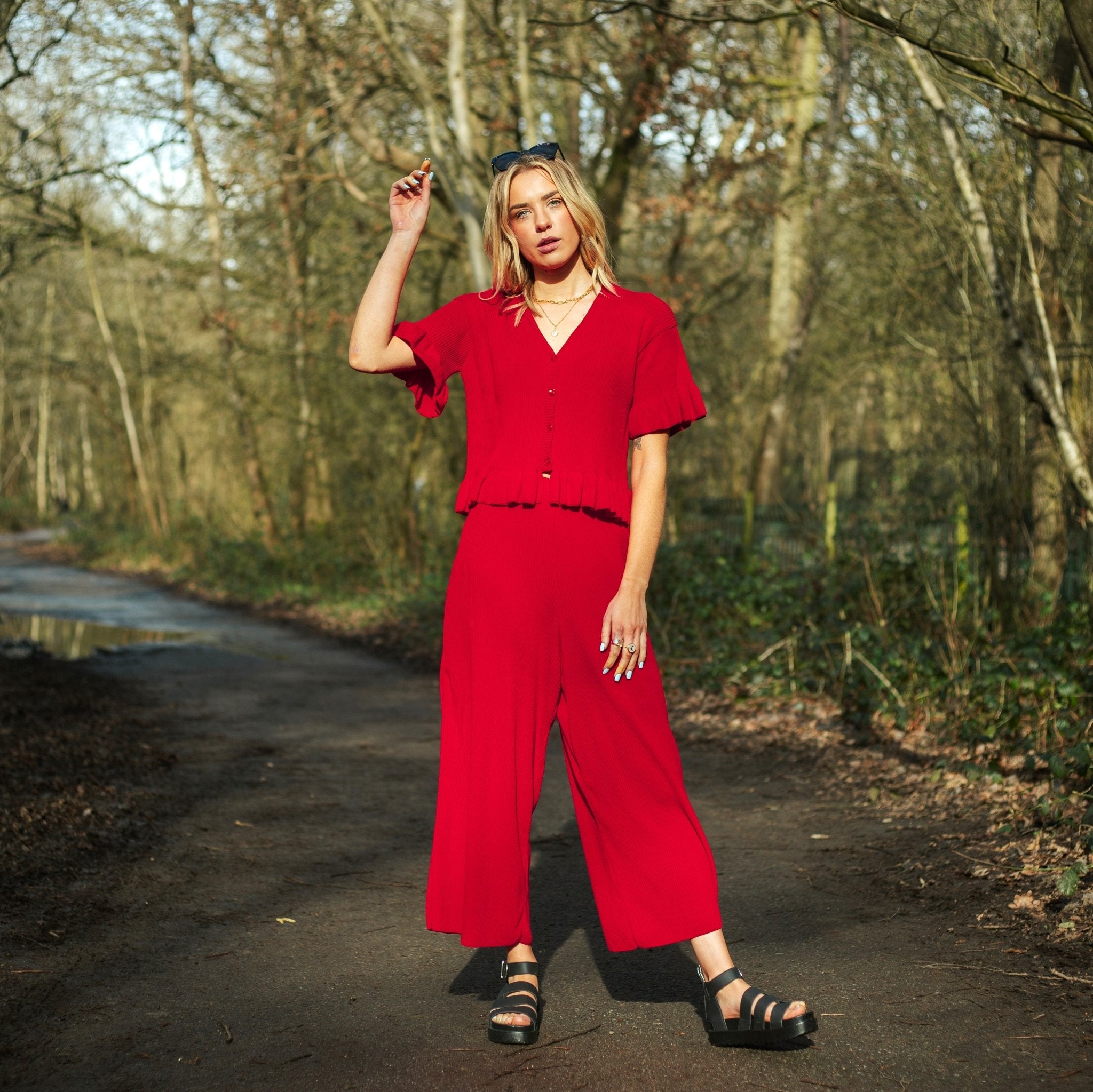 Introducing our Marlow Knitted Ruffle Sleeveless Cardigan in red – the prettiest summer cardigan around!