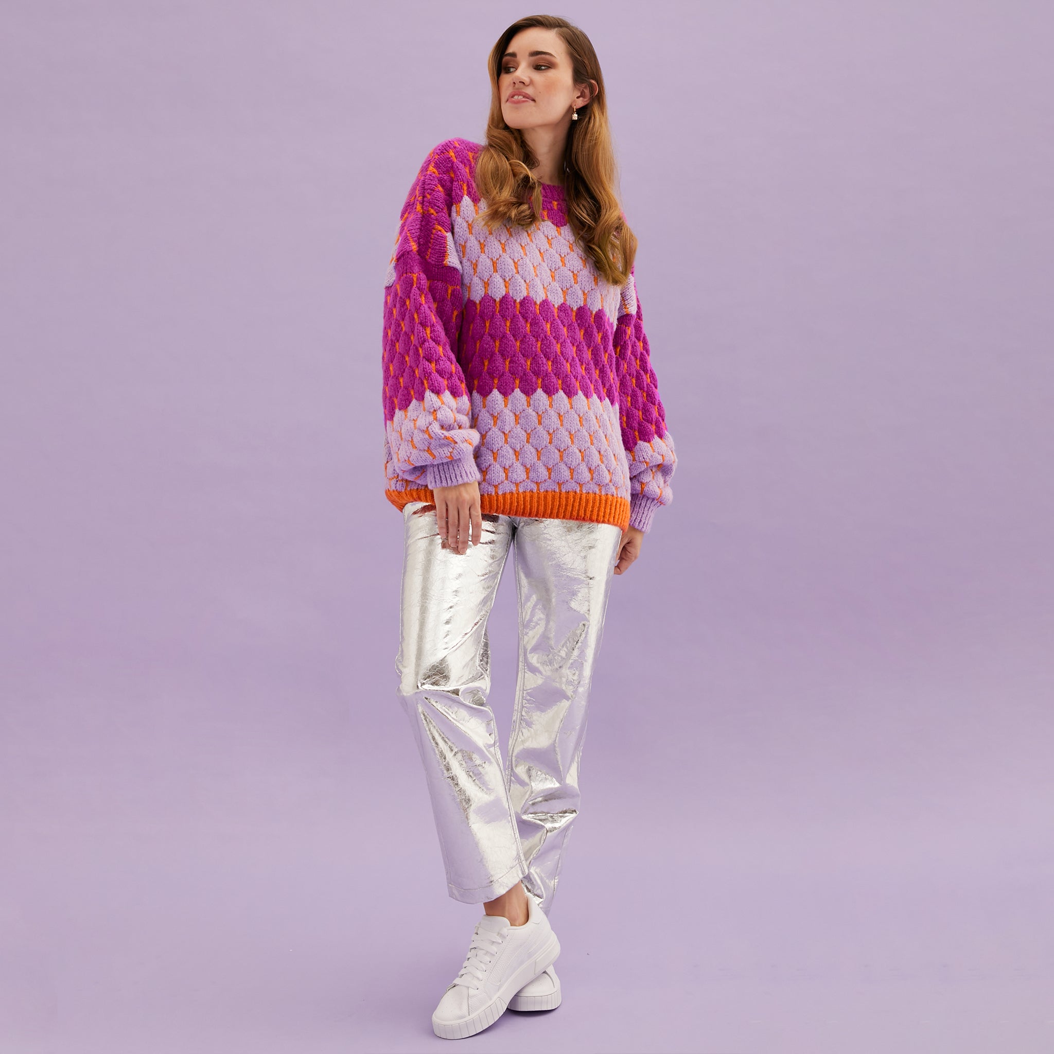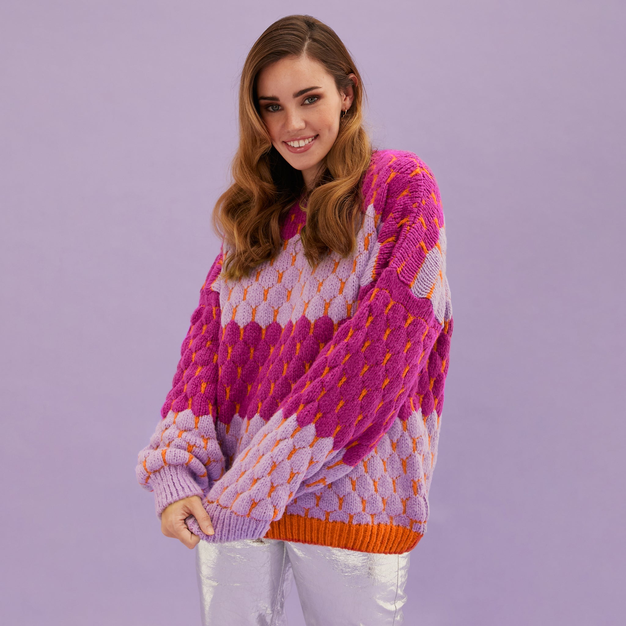 Bold, bright and bubbles! Say hello to our bubble stitch jumper Marissa. In fun bold contrasting colours, Marissa is made in an elevated bubble stitch bringing volume and joy to your wardrobe. With our signature balloon sleeves and in a relaxed oversized fit, this crew neck jumper will fast become your go-to knit this season, and seasons to come!