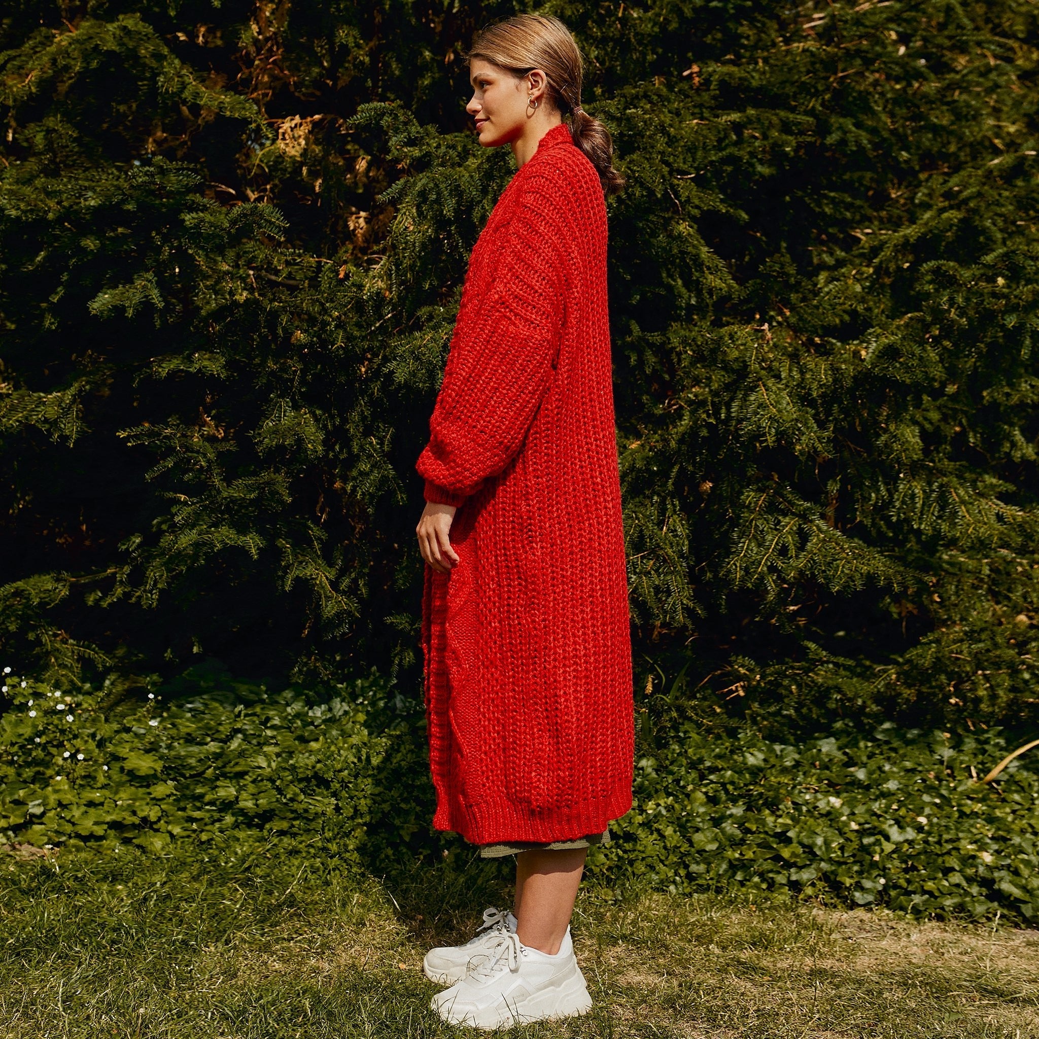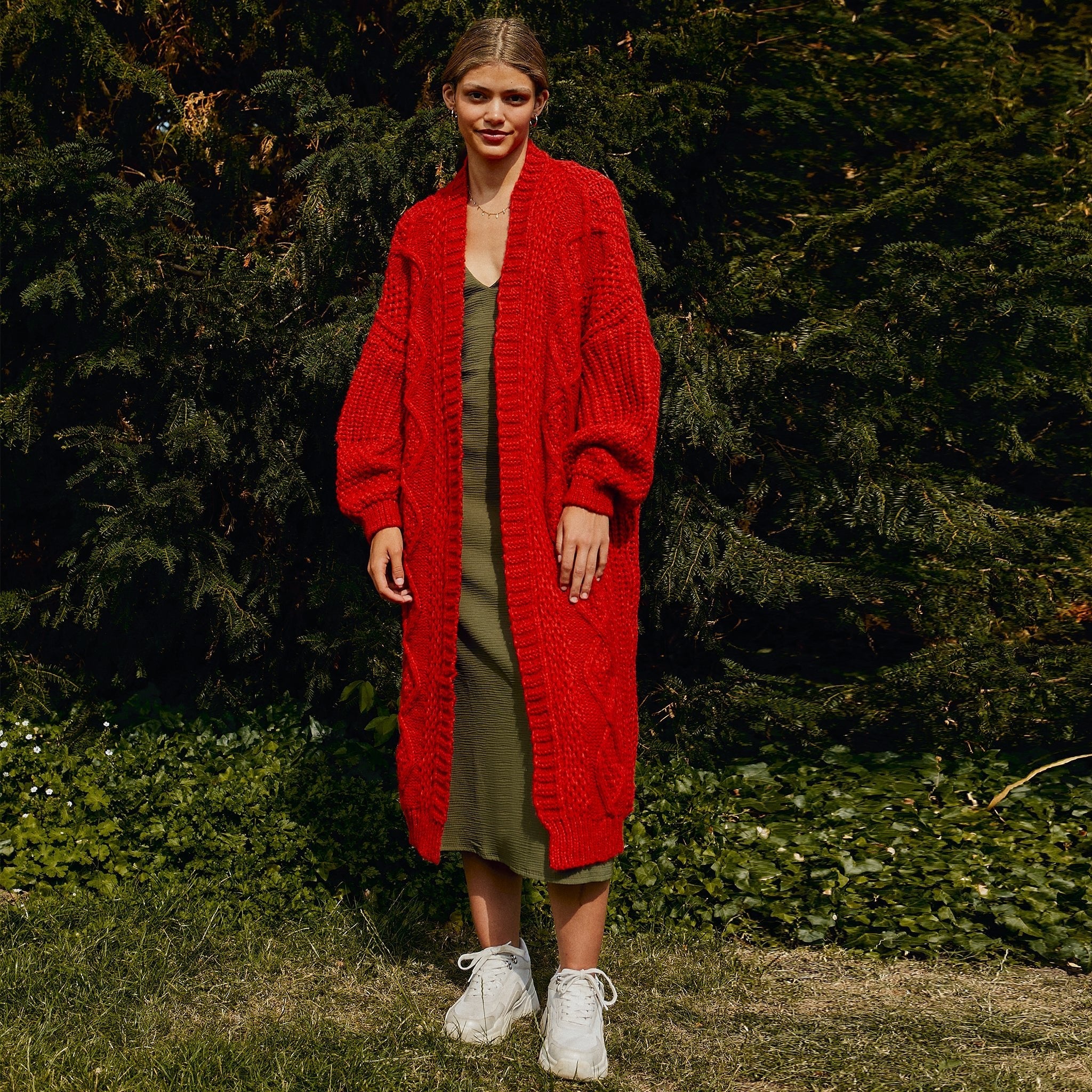Oversized in shape Stevie is no cable ordinary cardi, full of hidden detail, making you stand out from the crowd whilst being super comfy. With an elevated diamond cable stitch running down the front, Stevie has a stunning billowing balloon sleeve feature and a contrast stitch on the cuff, just to add that extra detail.