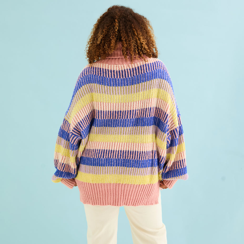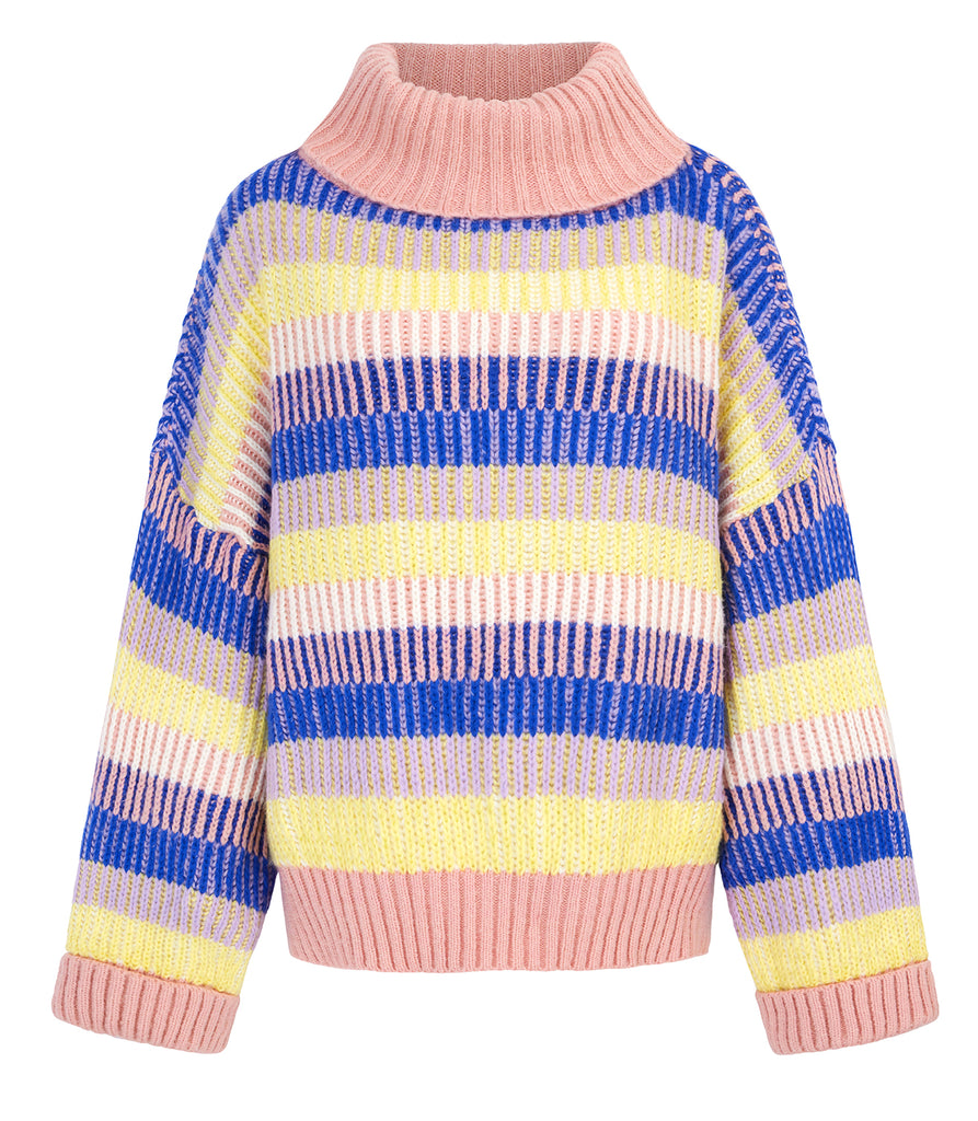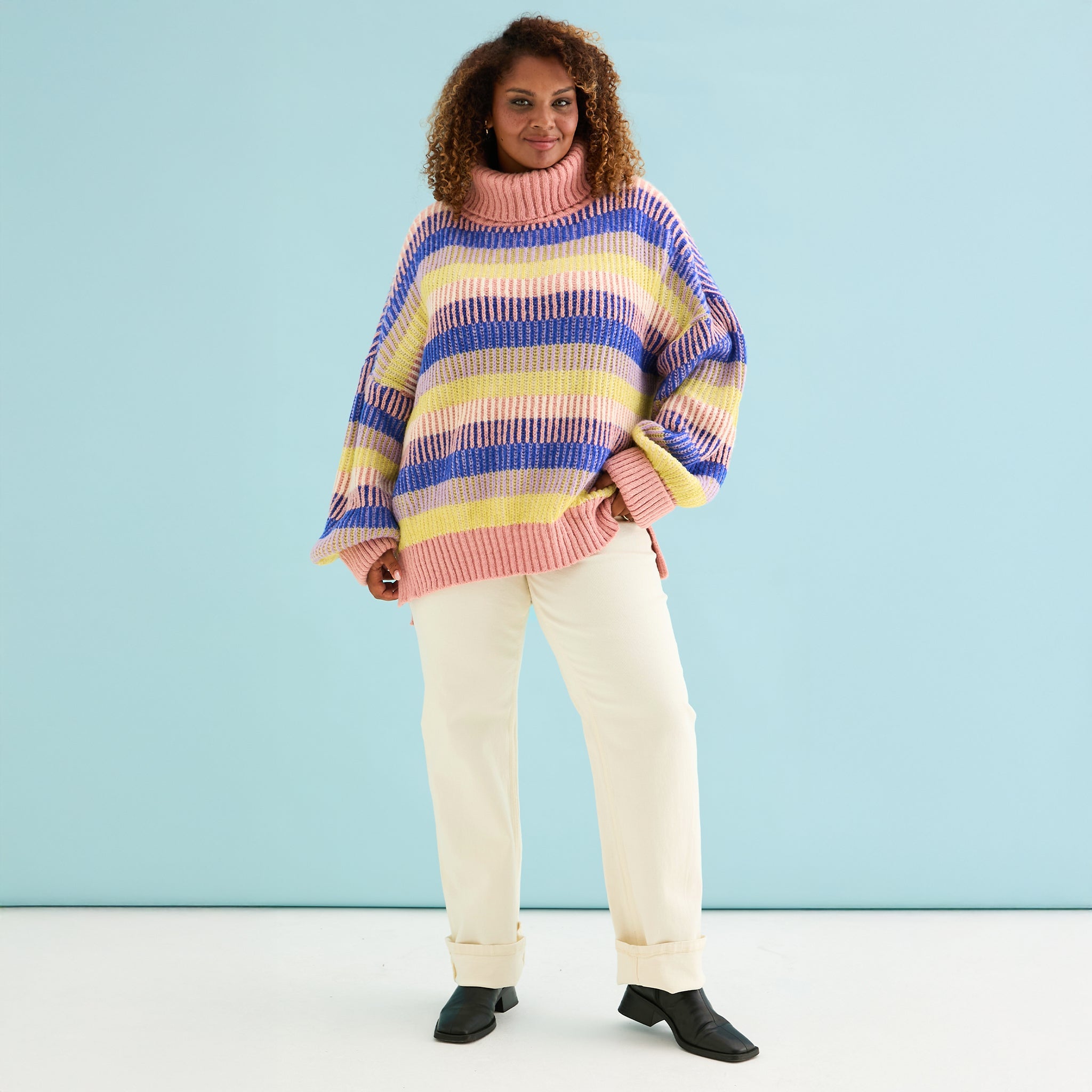 Our Phoebe Hat Leia Scarf and Tasha Jumper come together to create the dreamiest winter styling trio with playful stripe detailing on the accessories, and that signature oversized Tasha silhouette.
