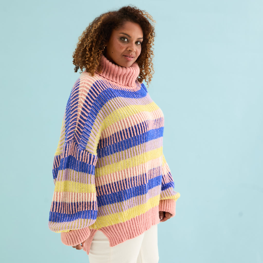The Phoebe Hat is warm, soft and slouchy with a sweet stripe detail. The Leia Scarf features the same stripe effect in an oversized longline knit that wraps beautifully. The Tasha Jumper ties it all together with a relaxed oversized fit and a gorgeous mix of stitches that feel joyful and effortless.