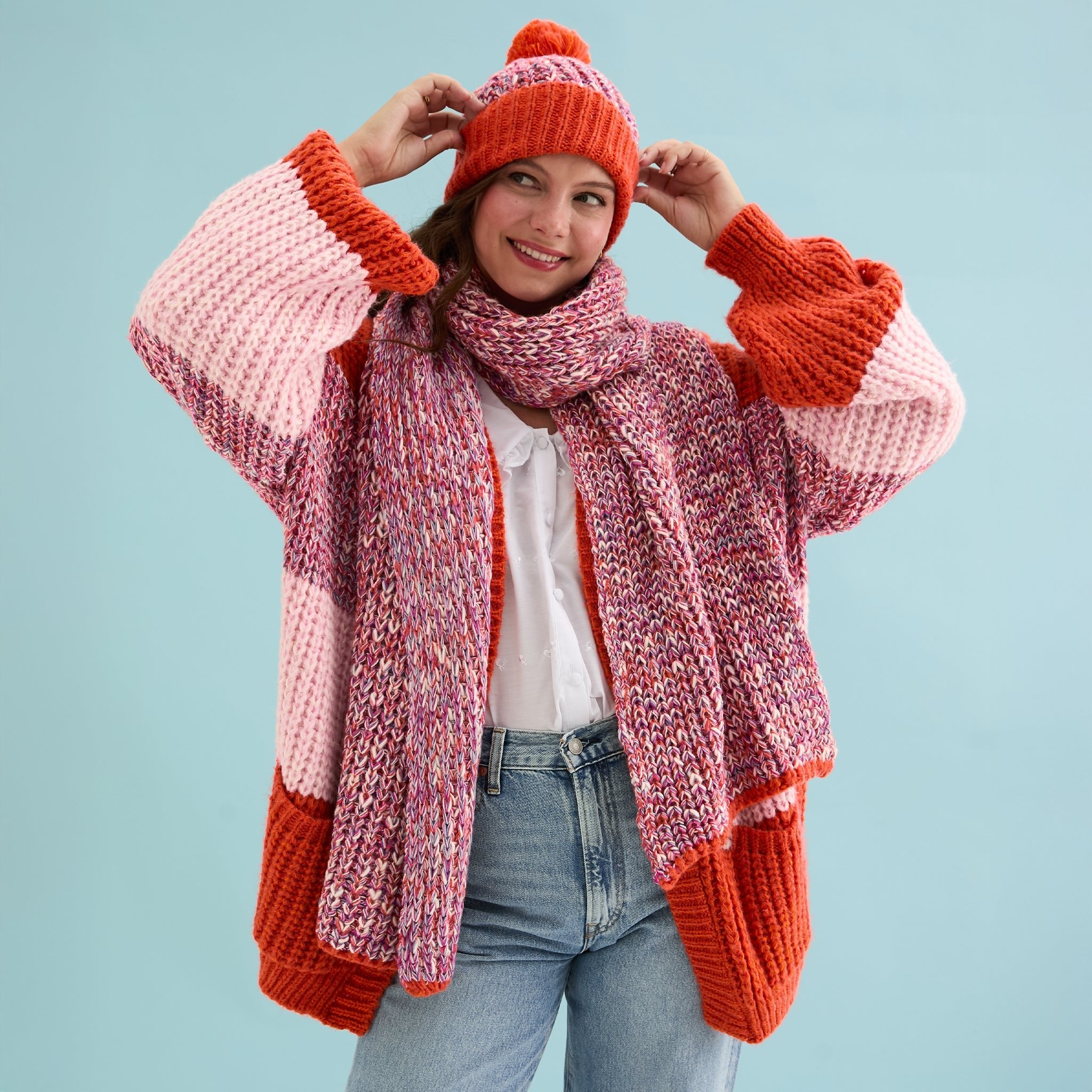 The Lolly Hat brings that slouchy comfy fit you love. The Florence Scarf is oversized longline and beautifully chunky with playful stitch detail. The Janie Cardi adds a gorgeous relaxed silhouette with rib and twist stitches that bring personality and joy to any outfit.